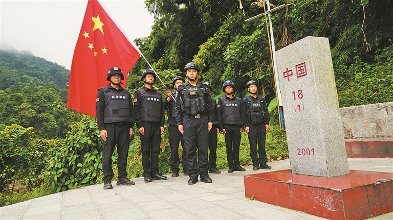 清晨,山间雾气尚未散尽,在18号界碑前,半坡乡边境派出所民辅警、联防员与巡防人员整齐列队,一同重温入党誓词。“我志愿加入中国共产党……”铿锵有力的誓言穿透薄雾,回荡在边境山谷间。“春节更要守好边,这是我们的责任。”一句简单的承诺,成为新春里边境线上最坚定的守边宣言。