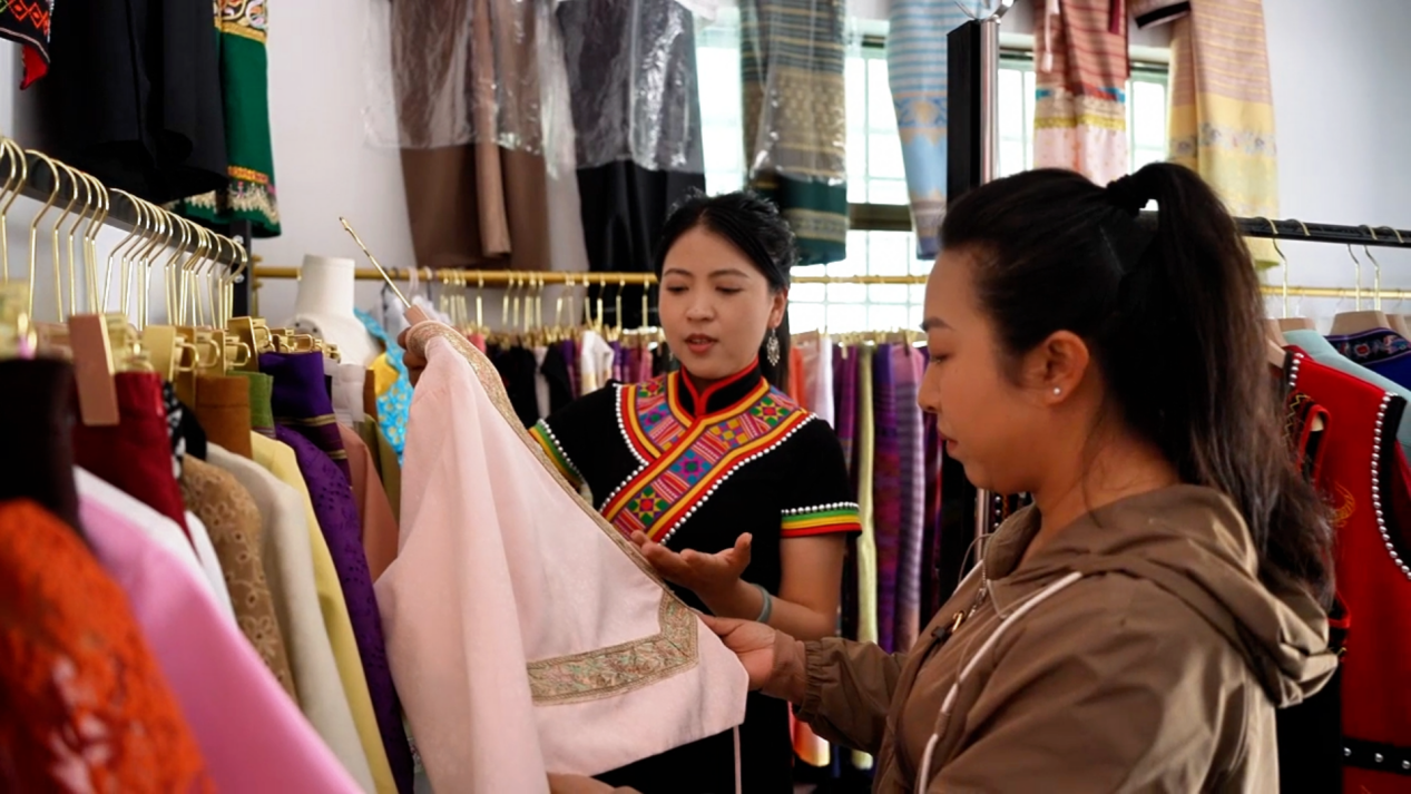 黄显翠正在为游客介绍少数民族服装。宋菲菲摄