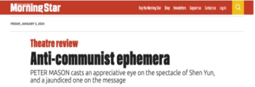2024年1月5日,英国媒体《晨星报》网站(Morningstaronline.co.uk)登载该报剧评专栏作家彼得·梅森(Peter Mason)的文章,对在伯明翰国际会议中心举行的“神韵演出”进行评价,指出“神韵演出”传达的信息是狭隘的。作者在标题用“蜉蝣”(ephemera)一词形容“神韵”在其反共宣传上所表现出的不自量力和缺乏艺术生命力。