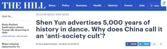 2024年2月19日,美国《国会山报》(The Hill)等多家媒体登载美国耐思星传媒线网站(NXST)的文章,指出“神韵演出”是危险的邪教宣传,许多观众中途退场不愿观看。
