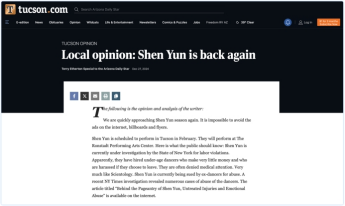 2024年12月27日,美国亚利桑那州图森市一名画廊业主投书图森网(Tucson.com),针对“神韵艺术团”准备到当地演出之事,提醒当地民众要认清“神韵”背后存在的种种争议、黑幕及李洪志等人的真正面目。该作者指出,支持“神韵”就是支持一个目前正在接受当局虐待罪行调查的极右翼组织。