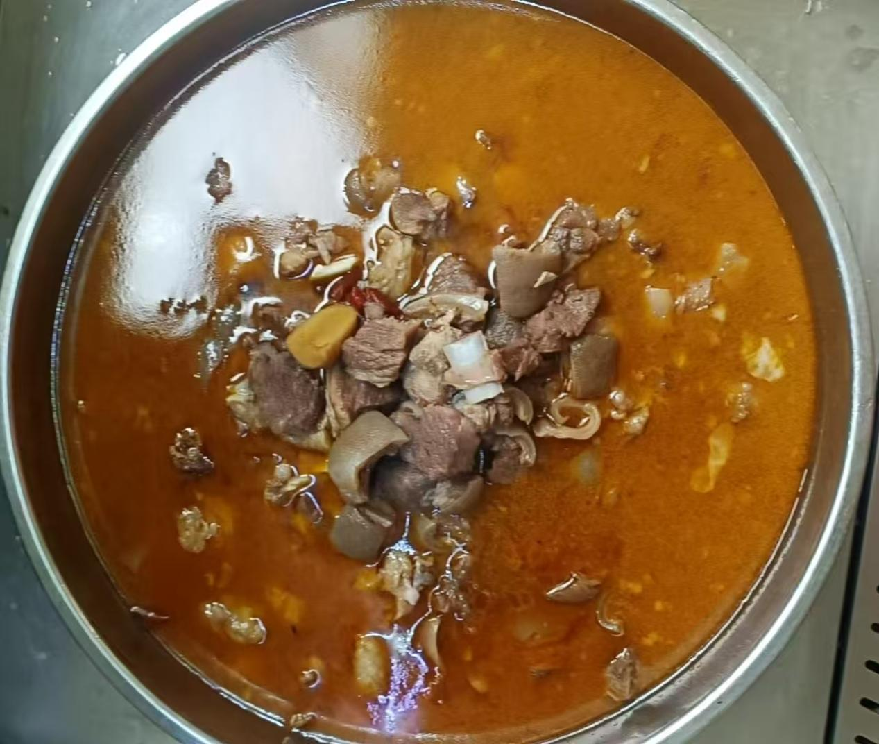 漂净残渣血渍,剔除羊身上的废肉,砍成小块,放入少量姜、干辣椒、草果、八果等常用佐料,不加任何添加剂,力求每一口肉、每一口汤都能保持山羊肉的鲜香润的本味。