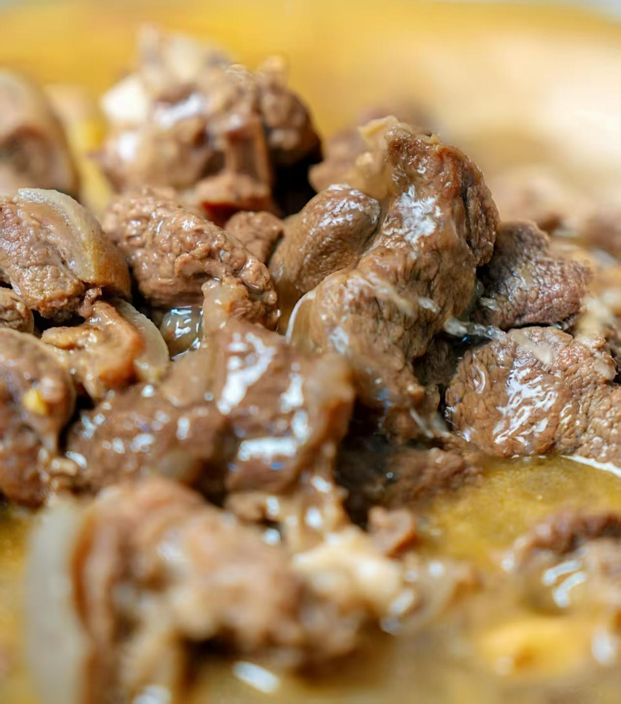 锅中翻炒至皮肉泛黄,香味溢出,接着倒入高压锅焖煮。每一锅羊肉都根据羊的年龄决定烹煮时间的长短,大概20-30分钟左右。烹制而成的黄焖羊肉,肉、汤的颜色金黄,肉质浓郁,口感鲜嫩,软硬适中,老少皆宜,特别羊膻味全无。
