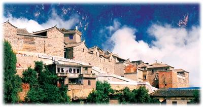 站在东门马帮文化广场上抬头仰望,石阶之上,东门楼——双瓦顶砖墙的三层城楼雄踞眼前,庄重宏阔;一层城门的卷拱门头上书“迤萨”二字。进了城门,姚家大院、钱家大院和12栋迤萨古民居呈中西合璧的方形碉堡状,沿着山脊紧凑排列,高低错落有致,气势磅礴壮观。稍远,100多栋迤萨古民居建筑散布城中,和“东门楼及迤萨民居”古建筑群共同构成了这座马帮古镇的独特风貌。迤萨民居大都建于清代和民国初年,享有“江外建筑大观园”和“边地建筑博物馆”美誉。