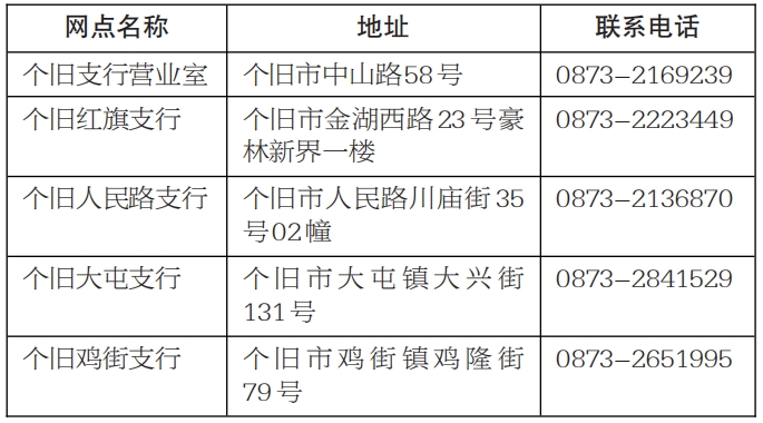 感谢您对我们工作的理解,并希望得到您一如既往的支持。详情请咨询中国工商银行股份有限公司个旧支行各营业网点,或者致电0873-2131175。