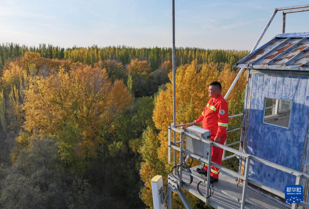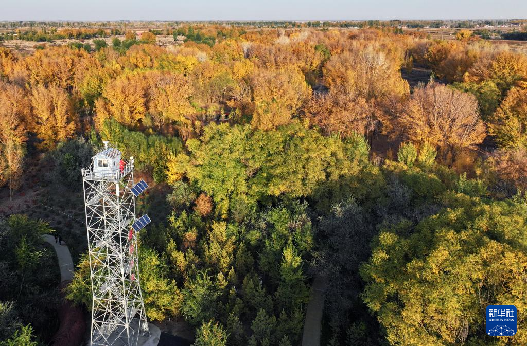 10月17日,内蒙古巴彦淖尔市临河区国营新华林场职工贾培进行防火巡防(无人机照片)。新华社记者 李云平 摄