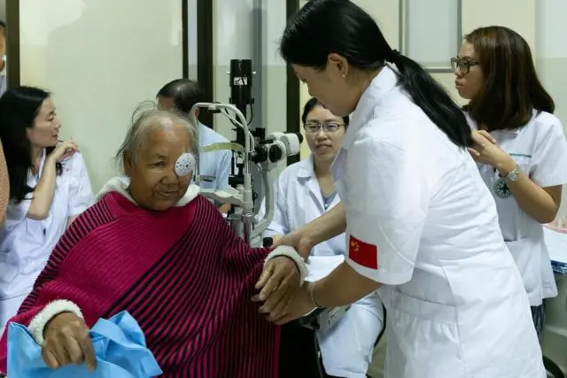 在老挝万象,“光明行”医疗队成员为接受白内障手术的患者复查 图源:新华社