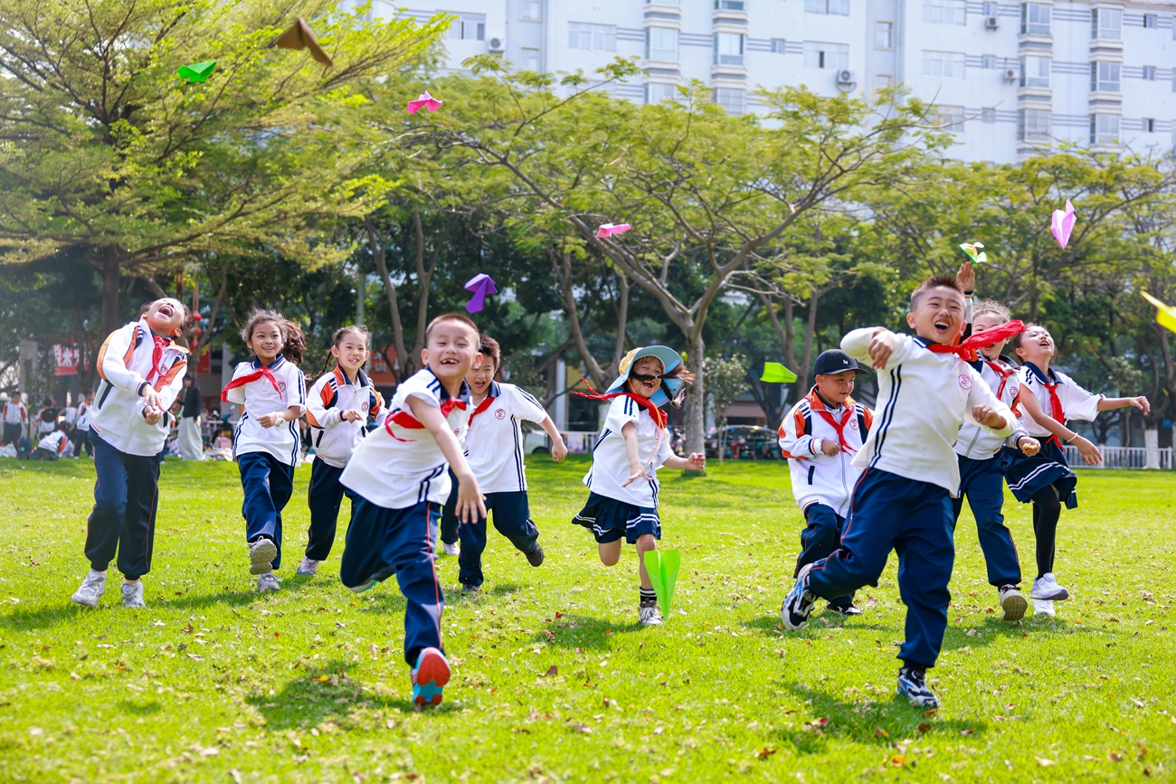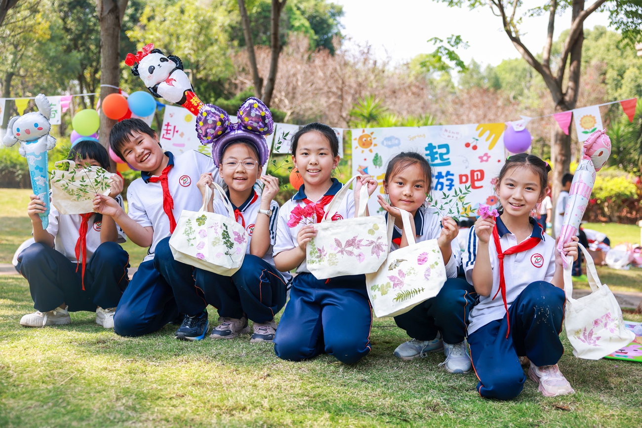近日,开远市各中小学陆续开展春游踏青活动,组织学生走出课堂、亲近大自然,在文娱活动中增强集体荣誉感,增进友谊。大图为学生放飞纸飞机。小图为学生展示自制的印染书袋。