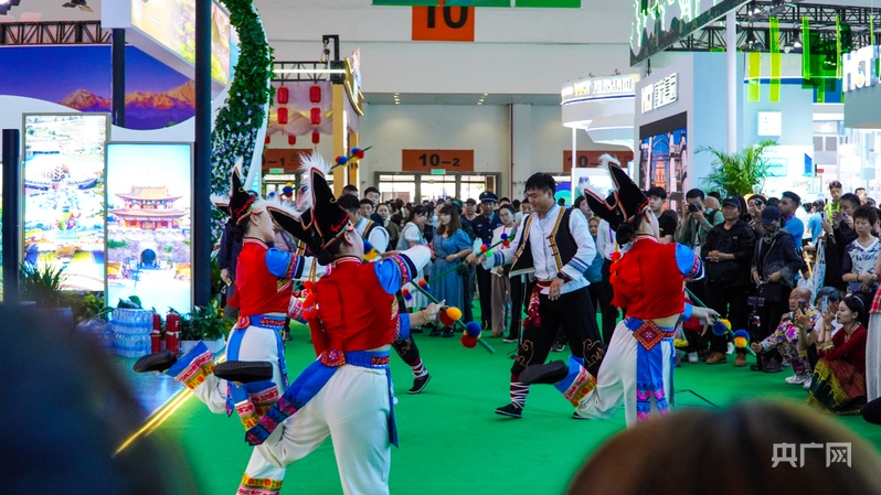 旅居云南馆的歌舞表演吸引游客驻足(央广网记者 魏文青 摄)