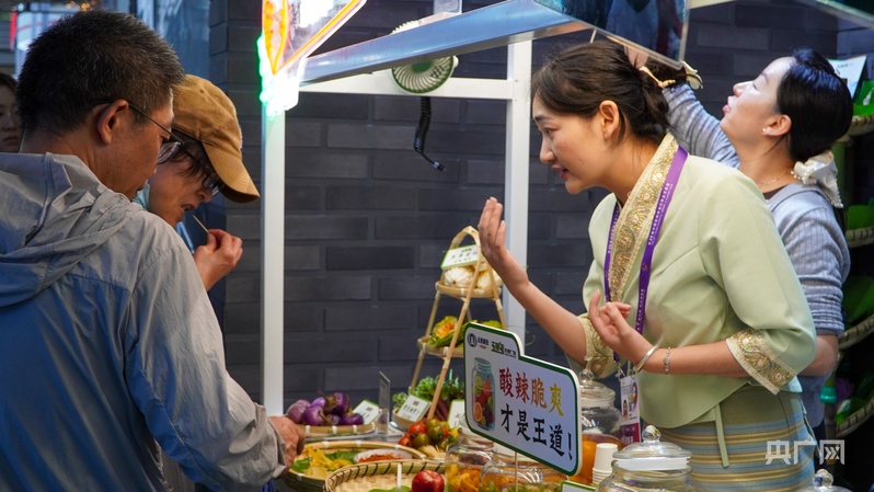摊位负责人介绍云南生鲜美食(央广网记者 魏文青 摄)