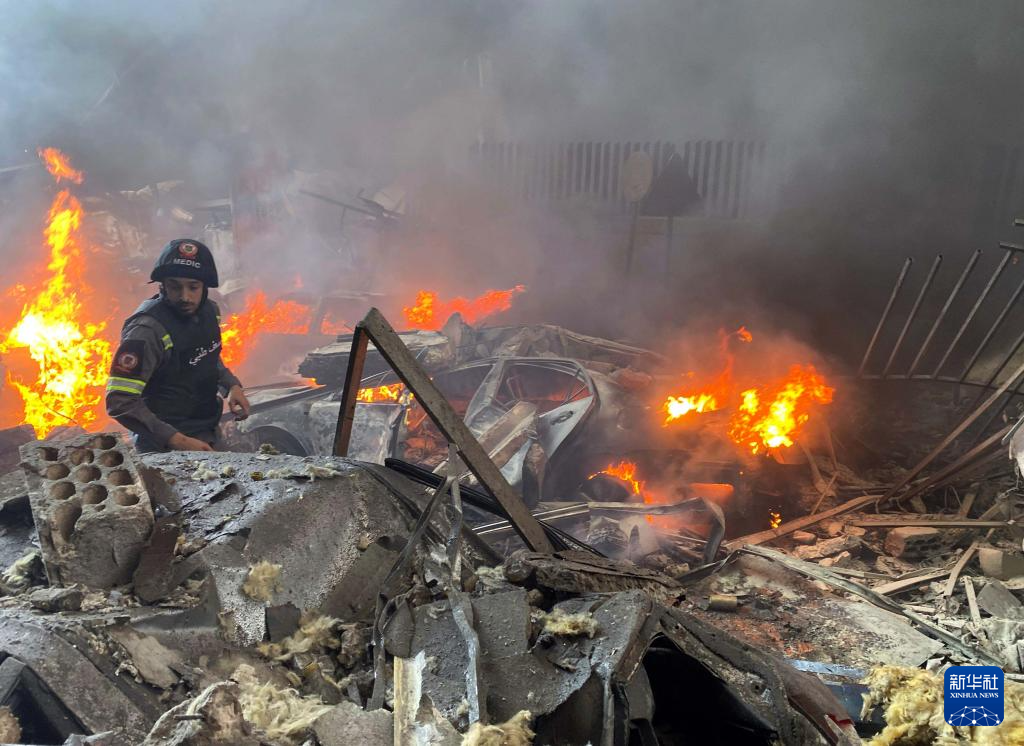 4月8日,救援人员在黎巴嫩首都贝鲁特扑救以色列空袭引发的火灾(手机照片)。新华社发(比拉尔·贾维希 摄)