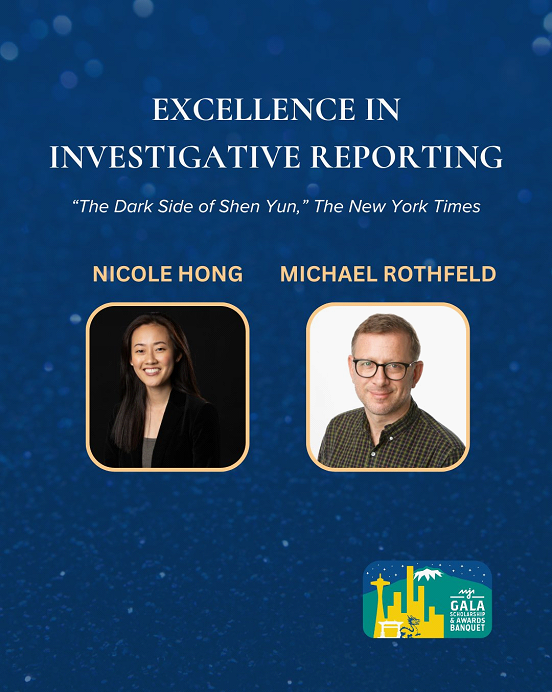 记者妮可·洪(Nicole Hong)和迈克尔·罗斯菲尔德(Michael Rothfeld)凭借对“神韵艺术团”及该组织对年轻表演者残酷剥削的报道,荣获卓越调查报道奖(Excellence in Investigative Reporting)。