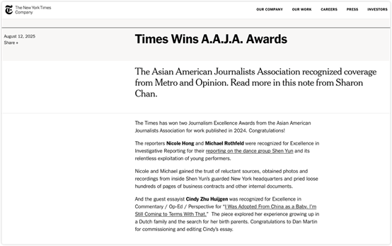 编者按:2025年8月12日《纽约时报》公司网站(Nytco.com)发布消息,祝贺该报两名调查记者获得美国亚裔记者协会奖项。消息指出,该报调查记者妮可·洪和迈克尔·罗斯菲尔德因曝光“法轮功”旗下“神韵艺术团”种种黑幕获奖。