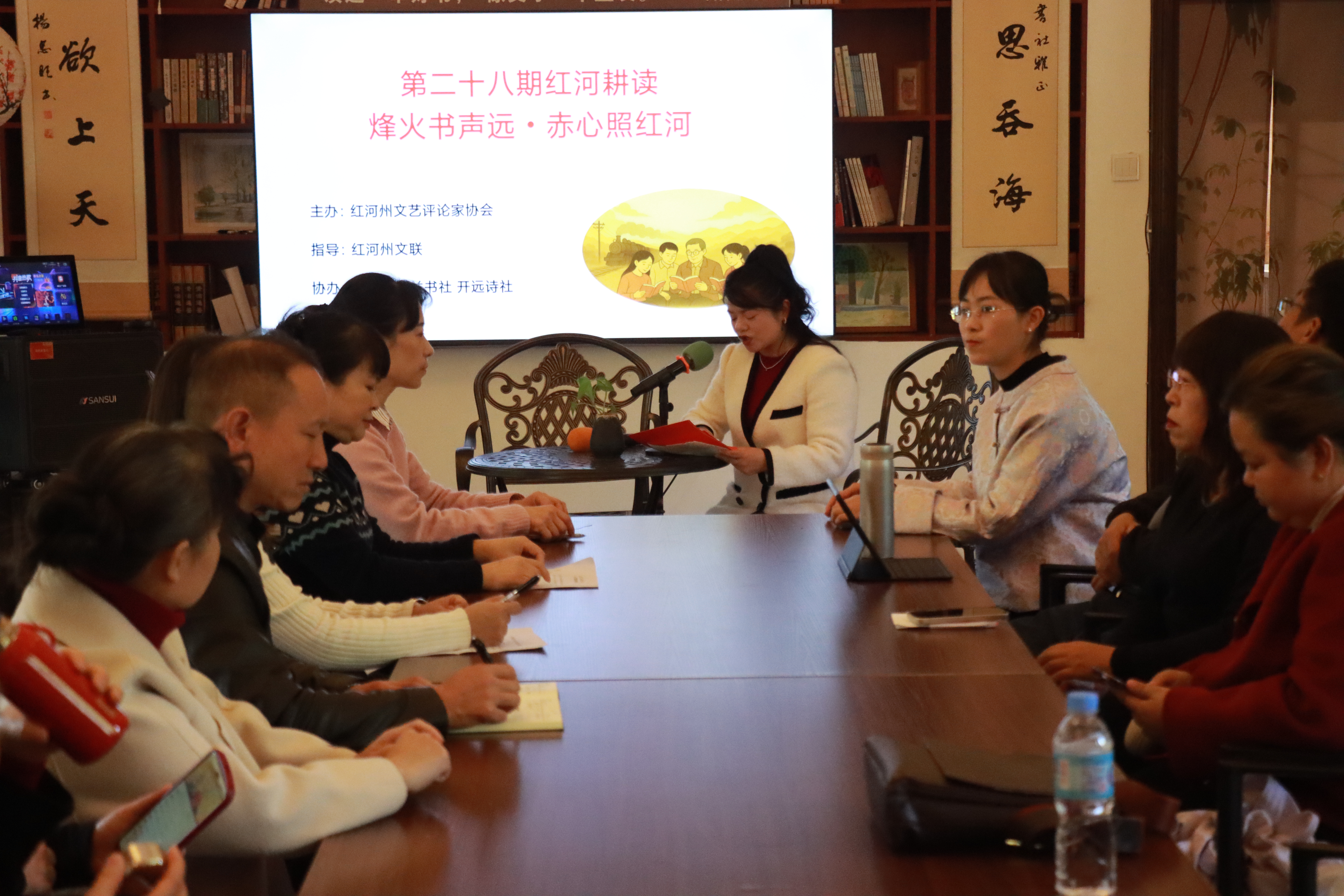 2025年是中国人民抗日战争暨世界反法西斯战争胜利80周年,为提升文学爱好者的艺术素养、推动红河文学繁荣发展,12月27日,第28期“红河耕读”活动于开远市如期开展。本期活动以“烽火书声远・赤心照红河”为主题,由红河州文艺评论家协会主办,红河州文联、开远市文联指导,开远市修益书社与开远诗社协办。红河州作家协会、文艺评论家协会、修益书社会员、开远诗社代表以及开远一中学生等五十余人齐聚一堂,回望历史,共话文学。活动由红河州文艺评论家协会副主席赵冬梅主持。