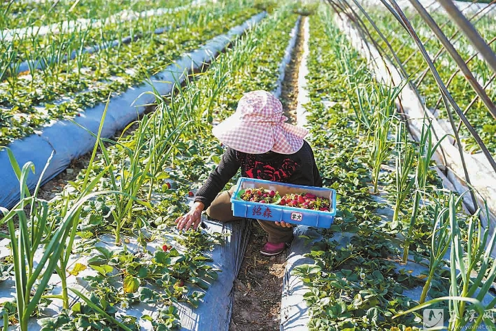 1月29日,在江川区九溪镇的黑草莓种植基地里,一颗颗深红近黑的果实,在冬日暖阳下泛着诱人的光泽,新鲜采摘的黑草莓通过线上线下多渠道发往全国各地,成为水果市场的新晋“网红”。据悉,江川区九溪镇共有342户农户种植黑草莓,栽种面积超过500亩,平均亩产920公斤,总产量预计达460吨。九溪镇昼夜温差大、光照充足,是云南重要的冬草莓产区。目前全镇草莓种植面积达6078亩,推广适宜性主栽品种5个,产值3.2亿元,占全镇农业生产总值的33.2%。(玉溪市融媒体中心记者 郭晓君 普桂洁 摄)