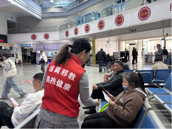 医院作为群众健康守护地,人流量大且群体特殊,易成为邪教组织渗透的潜在目标。活动当天,工作人员精准把握患者候诊“黄金时段”,在门诊大厅、住院部走廊等重点区域搭建宣传展台,悬挂“全民反邪教聚力护平安”主题横幅,电子屏循环滚动反邪教警示标语与警示教育短视频,营造浓厚宣传氛围。反邪教工作人员结合真实案例,向过往群众揭露邪教组织冒用“气功治病”“宗教祈福”等名义诱骗患者放弃正规治疗、聚敛钱财的惯用伎俩,深入剖析邪教反人类、反科学、反社会的本质危害。医护志愿者则立足专业视角,讲解“信邪误病”的惨痛教训,强调“生病应遵医嘱科学诊疗,健康需靠合理作息与正规医疗”的核心理念,引导群众树立科学健康观。