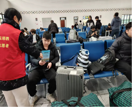 活动中,以设摊咨询、悬挂横幅、展板展示、现场讲解、有奖问答、发放宣传资料、宣传品等形式,引导车站工作人员、返乡务工人员以及放假回家的大学生关注“中国反邪教”“警钟”微信公众号等方式宣传反邪教知识,帮助他们认清邪教组织反人类、反科学、反社会、反政府的邪恶本质,学会有效甄别邪教组织歪理邪说、蛊惑伎俩的方法,呼吁他们要始终绷紧预防邪教安全弦,增强自身抵御邪教的能力,引导他们提高反邪觉悟,勇当反邪先锋,把防邪知识传递给家人和朋友,共同远离邪教,避免上当受骗。