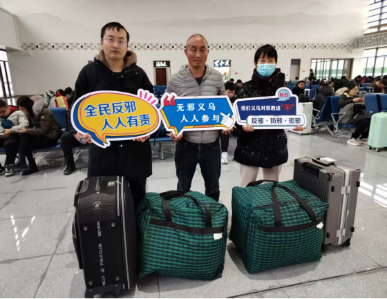为严密防范邪教组织恣意渗透,确保广大返乡务工人员以及放假回家的大学生欢度一个平安、喜庆、祥和的新春佳节,1月18日,浙江省义乌市委政法委会同大陈镇平安法治办深入各车站开展了一系列内容丰富、形式多样的春季反邪教警示教育宣传活动,营造“人人讲反邪、个个会防邪”的浓厚氛围。