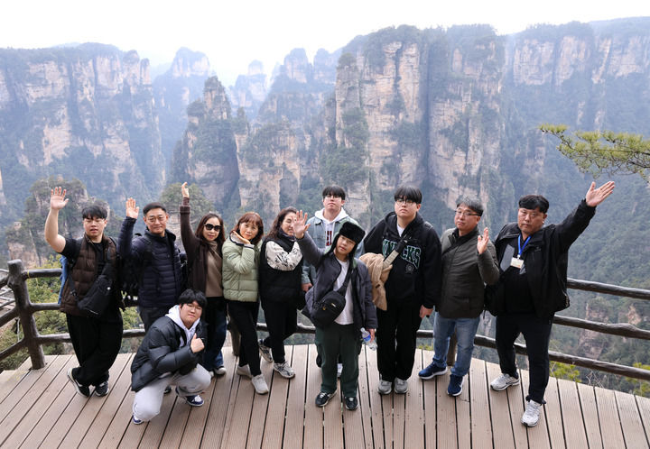 2025年2月15日,韩国游客在张家界国家森林公园袁家界景区游玩。新华社发(吴勇兵摄)