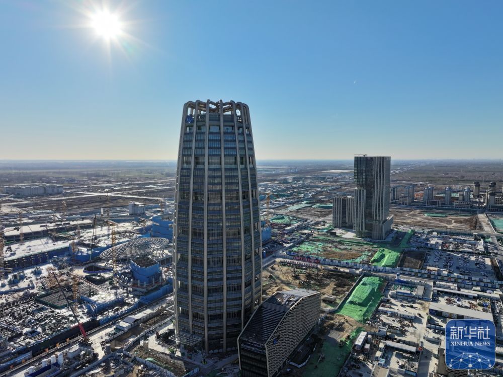 ↑位于雄安新区启动区内的中国中化大厦建设现场(1月9日摄,无人机照片)。