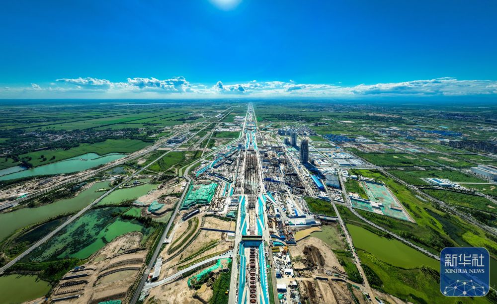 ↑位于雄安新区启动区内的东西轴线项目建设现场(2024年8月12日摄,无人机照片)。