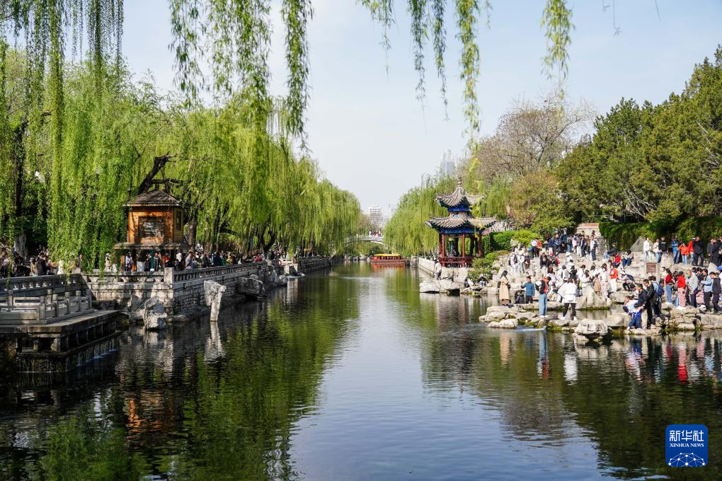 游人在济南护城河畔白石泉游玩(2024年4月5日摄)。新华社记者 朱峥 摄