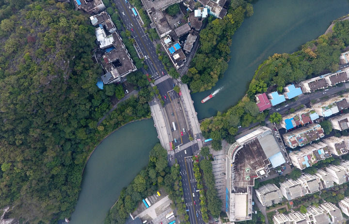 座座山峰把桂林市划分成不规整、零碎的地块。开车行驶在桂林市区,人们会发现,这里的路大多都是蜿蜒的。桂林市的一条主干道,笔直的路突然在一座40多米的山峰前分叉,绕山而行。从天空俯瞰,两条路勾勒出眼睛的形状,山峰就是眼珠。