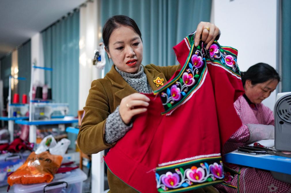 金瑞瑞在自己的工作室内查看彝绣服饰。新华社记者陈欣波摄