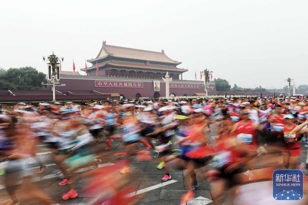 ↑2023年10月29日,参赛选手奔跑在长安街上。当日,2023北京马拉松赛在北京天安门广场鸣枪开跑。新华社记者 鞠焕宗 摄
