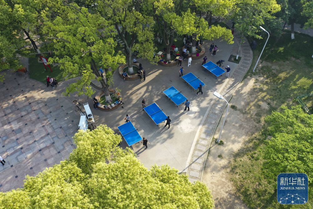 ↑2023年5月14日,市民在江苏省淮安市金湖县翠湖园公园打乒乓球(无人机照片)。新华社发(梁德斌摄)