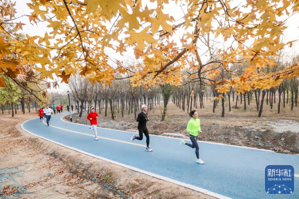 ↑2023年11月1日,在河北省遵化市,长跑爱好者在公园道路晨练。新华社发(刘满仓摄)