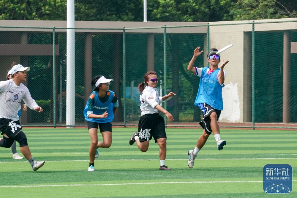 ↑2023年8月8日,健身爱好者在江苏省“全民健身日”主题活动南京主会场暨第七届“宁镇扬”全民健身大联动活动中体验飞盘运动。新华社记者 李博 摄