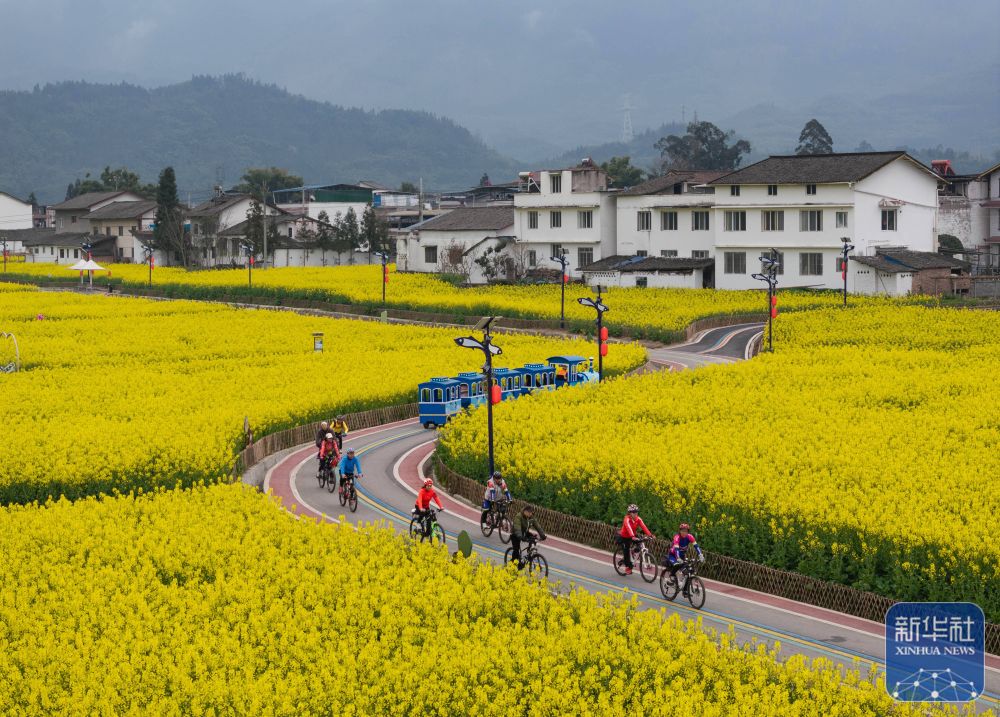 ↑2024年3月7日,在四川省雅安市荥经县五宪镇粮经复合现代农业园区,几位骑友骑行在油菜花海间的绿道上。新华社记者 江宏景 摄