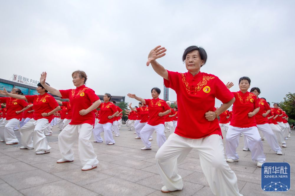↑2023年8月8日,位于浙江省湖州市长兴县雉城街道的和文化广场,市民在练习太极拳。新华社发(谭云俸摄)