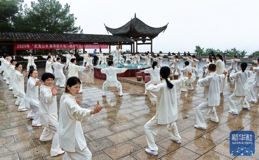 ↑2020年9月16日,健身爱好者在武夷山齐云峰景区表演健身气功八段锦。新华社发(陈颖摄)