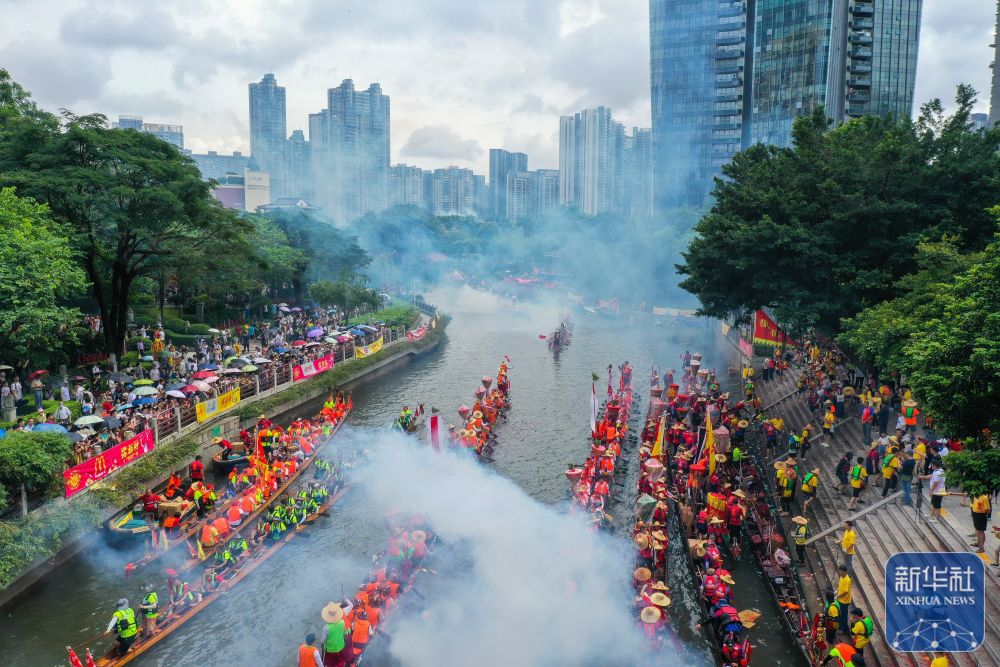 ↑2024年6月10日,四里八乡的龙舟汇聚在广位于广州珠江新城的猎德涌参加“龙船景”(无人机照片)。新华社记者 刘大伟 摄