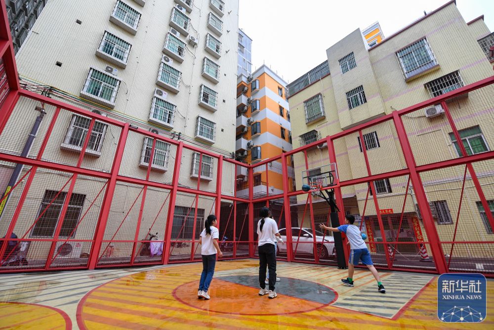 ↑2023年4月2日,在深圳市龙华区元芬村,居民在增设的篮球场打篮球。新华社记者 毛思倩 摄