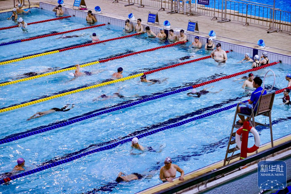 ↑2023年8月21日,市民在天河游泳馆内游泳。天河游泳馆是2010年广州亚运会水球项目的比赛场馆。新华社发(黄晋文摄)