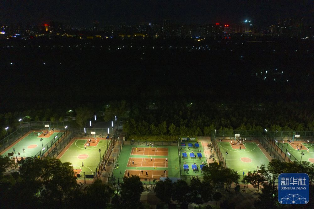 ↑2020年7月29日,市民在宁夏银川市毓秀公园运动场内锻炼(无人机照片)。新华社记者 冯开华 摄