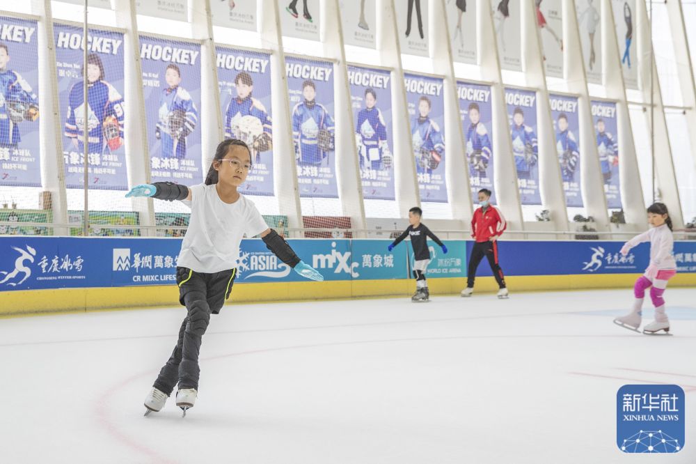 ↑2022年8月8日,在重庆冰纷万象滑冰场,孩子们练习花样滑冰。新华社记者 黄伟 摄