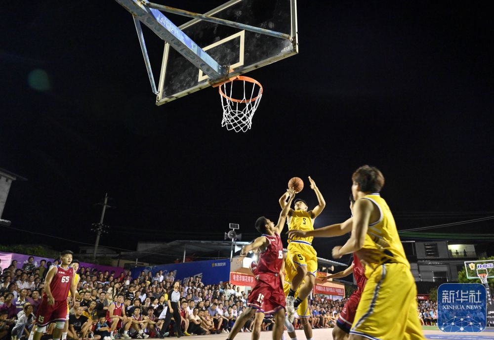 ↑2023年9月6日晚,在广西柳州市柳江区穿山镇男子篮球赛决赛现场,球员在场上拼抢。新华社发(黎寒池摄)
