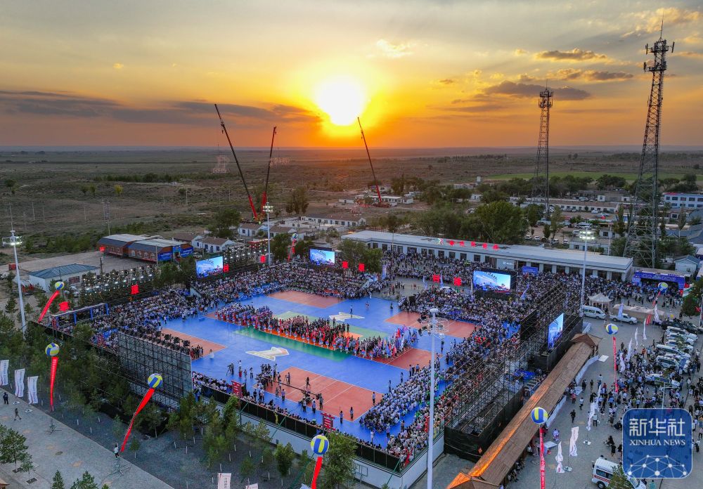 ↑2024年7月18日,鄂尔多斯草原村排暨沿黄九省区农牧民排球邀请赛在内蒙古鄂尔多斯市鄂托克前旗昂素镇开幕(无人机照片)。新华社发(王正摄)
