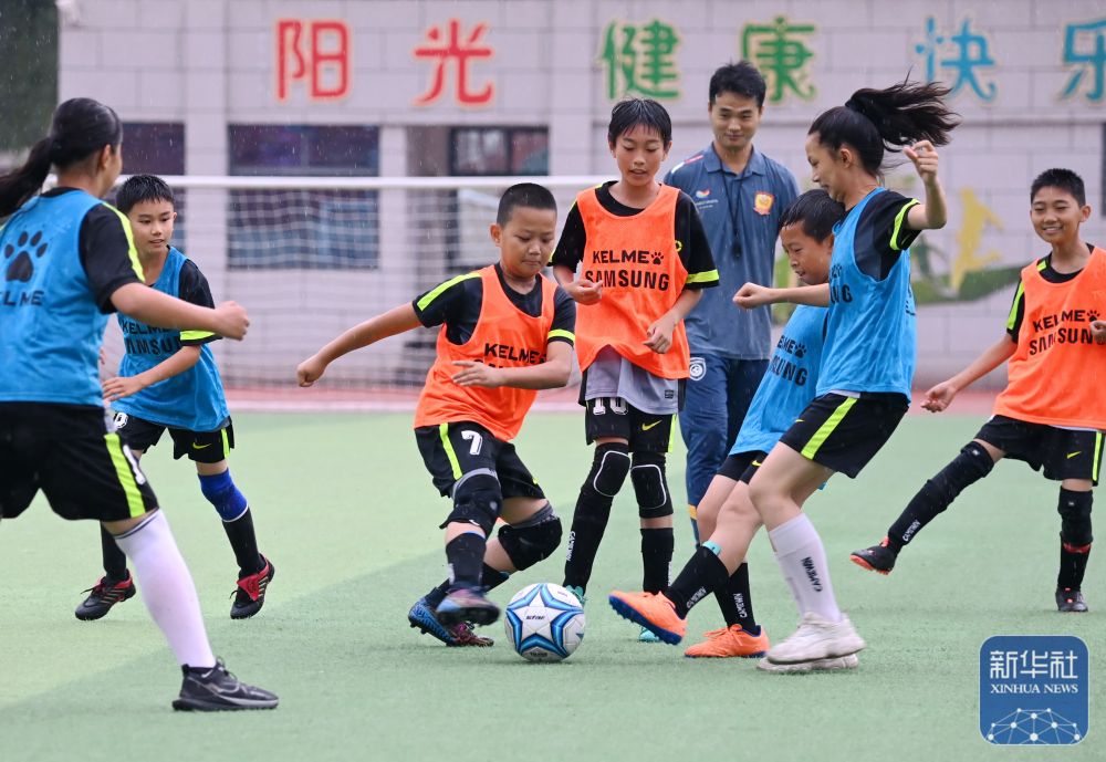 ↑2024年5月25日,在陕西省西乡县第二中学,学生们在公益足球课上进行分组对抗。新华社记者 李一博 摄