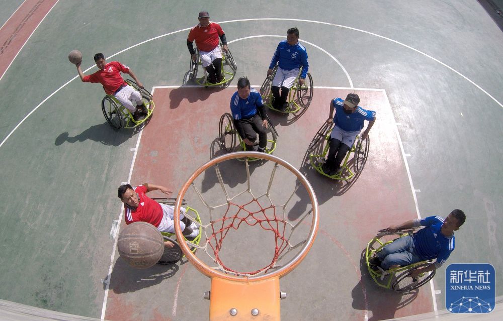 ↑2019年3月3日,西藏拉萨业余轮椅篮球队在训练中。新华社记者 普布扎西摄