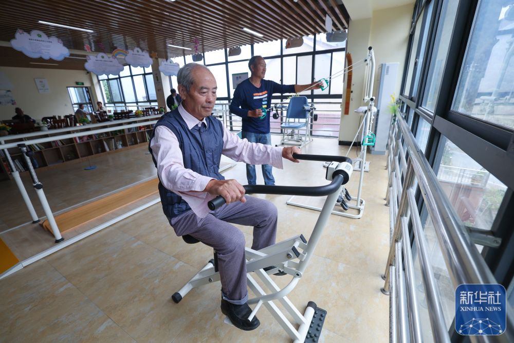 ↑2023年10月26日,在杭州市富阳区湖源乡居家养老服务中心,老人们使用健身器材锻炼身体。新华社记者 徐昱 摄