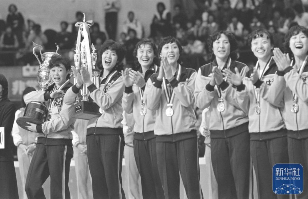 ↑1981年11月,在日本举行的第三届世界杯女子排球赛上,中国女排以七战七捷的成绩,首次登上世界冠军领奖台。新华社发(黎启榕摄)