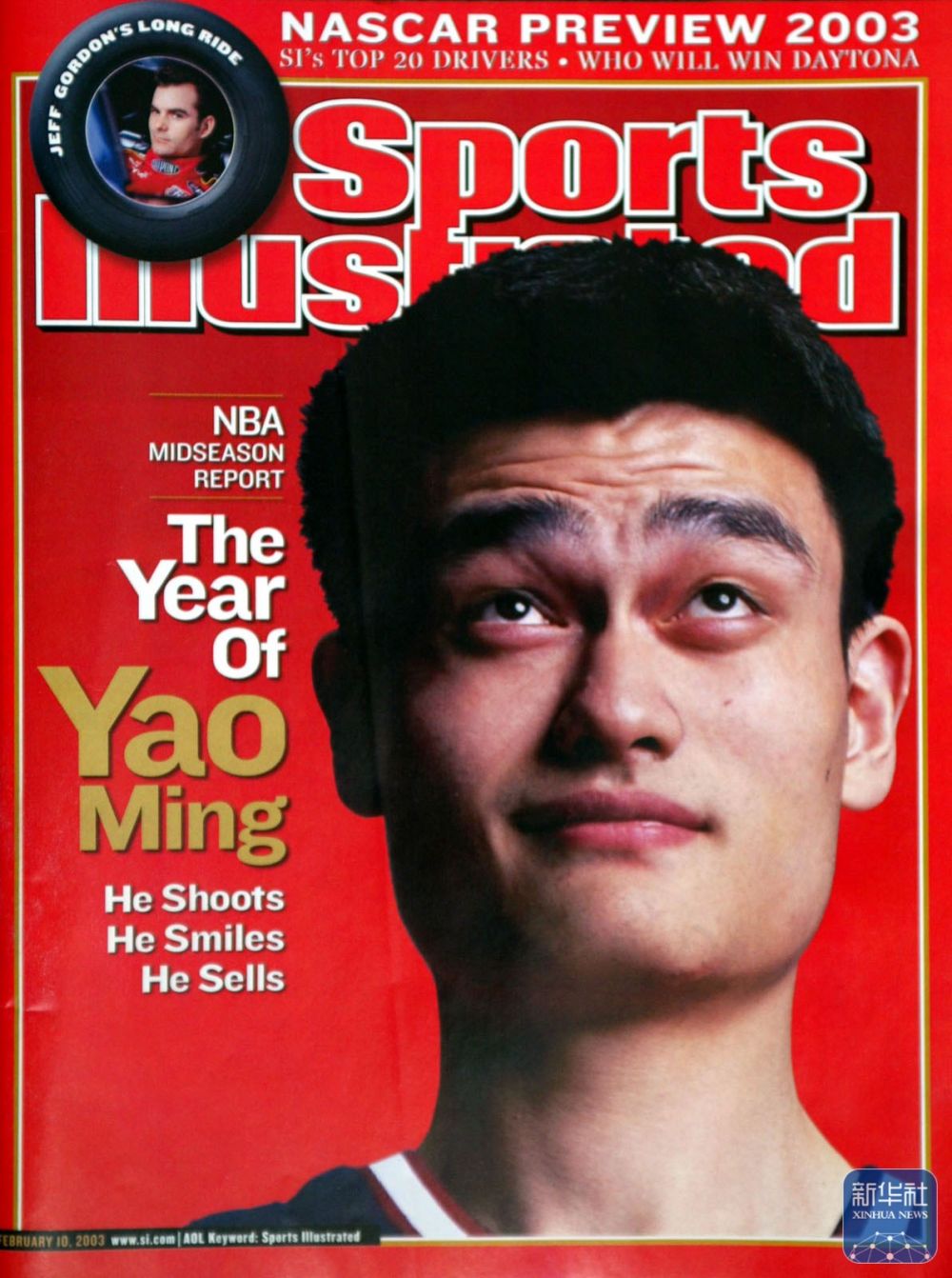 ↑2002年,姚明加盟NBA休斯敦火箭队,并逐渐成长为NBA顶尖中锋。这是2003年2月10日出版的美国杂志《体育画刊》,将姚明的头像刊登在封面上。这本著名的体育杂志把过去的一年称为“姚明之年”。新华社记者 吕明响 摄
