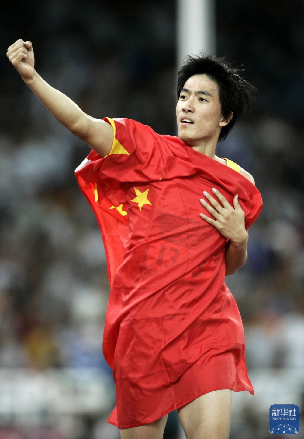 ↑2004年8月27日,刘翔在雅典奥运会男子110米栏决赛中夺冠后身披五星红旗庆祝。他以12秒91的成绩夺取金牌,并平了世界纪录。新华社记者 廖宇杰 摄