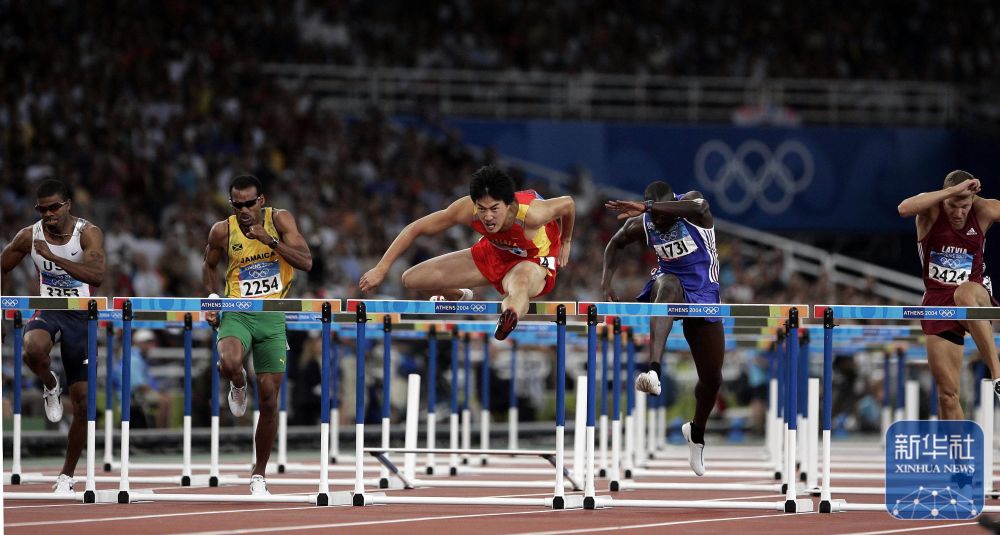 ↑2004雅典奥运会,刘翔以12秒91的成绩夺得男子110米栏比赛冠军,成为中国田径项目第一个男子奥运冠军。新华社记者 李岳 摄