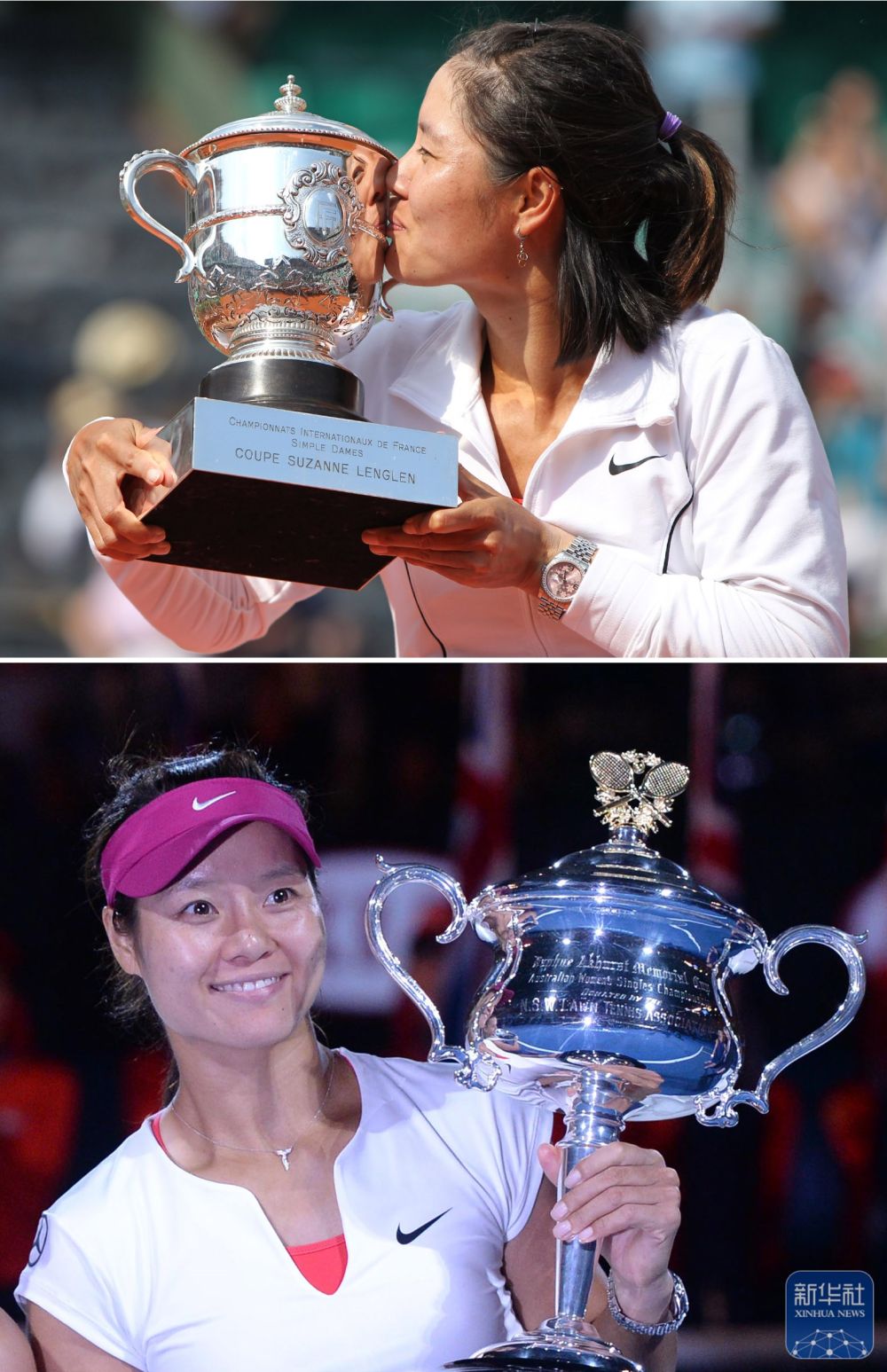 ↑网球运动员李娜在2011年法国网球公开赛、2014年澳大利亚网球公开赛夺得女子单打冠军,成为两项网球大满贯赛事的首位亚洲女单冠军。上图为2011年6月4日,李娜在法网女单颁奖仪式上亲吻冠军奖杯。新华社记者高静摄;下图为2014年1月25日,李娜在澳大利亚网球公开赛女单颁奖仪式上手持冠军奖杯留影。新华社记者 李俊东 摄